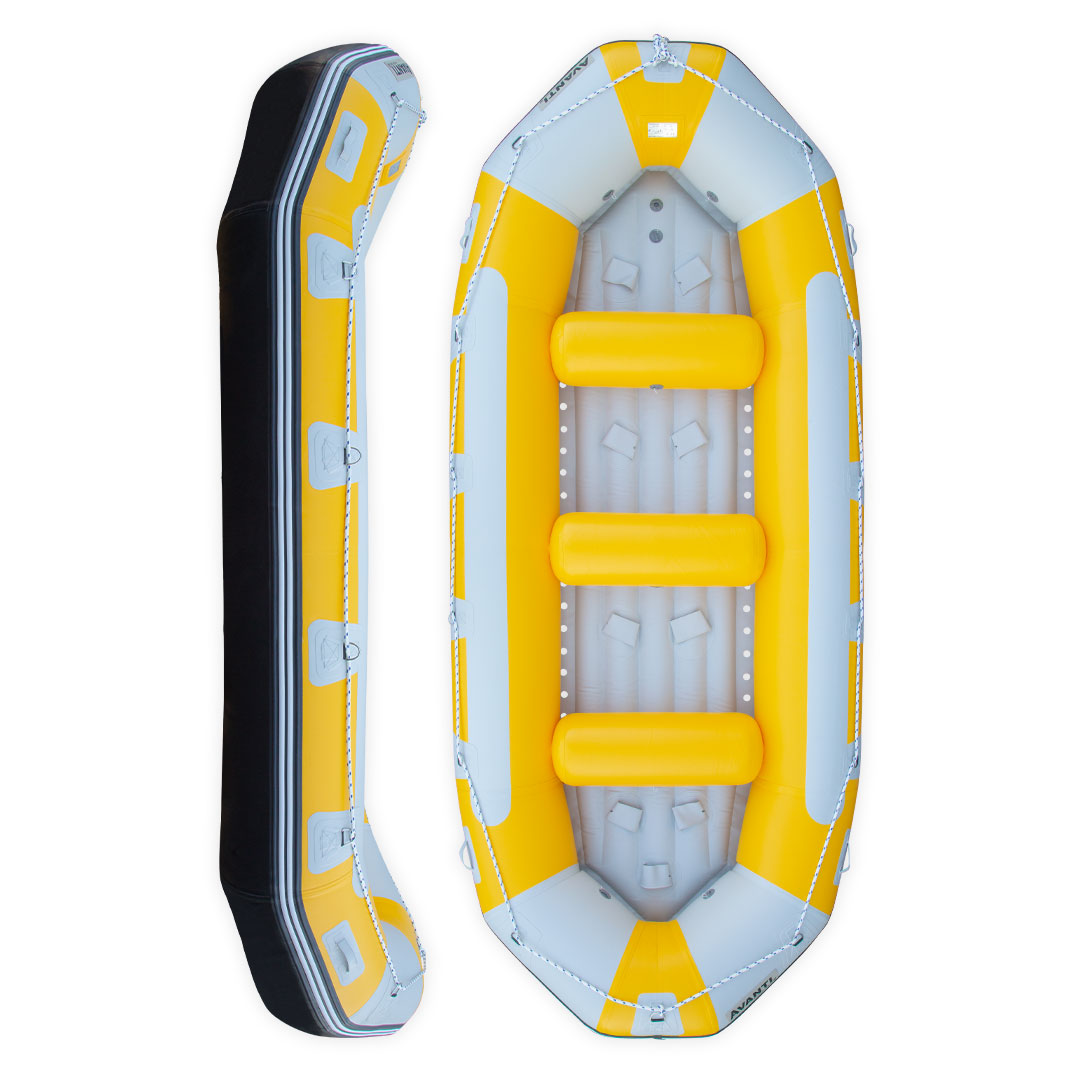The AVANTI 445 raft can accommodate up to 9 people. Tubes made of 1100 DTEX PVC fabric with lining under the tubes and under the bottom in 1680 DTEX, carrying handles are made of reinforced PVC, thwarts are sewn and glued, reinforced D-rings. The high quality fabric will guarantee you a very good flexion and mobility during the navigation. For a better resistance to abrasion, the tubes are lined up to the anti-scratch strip.