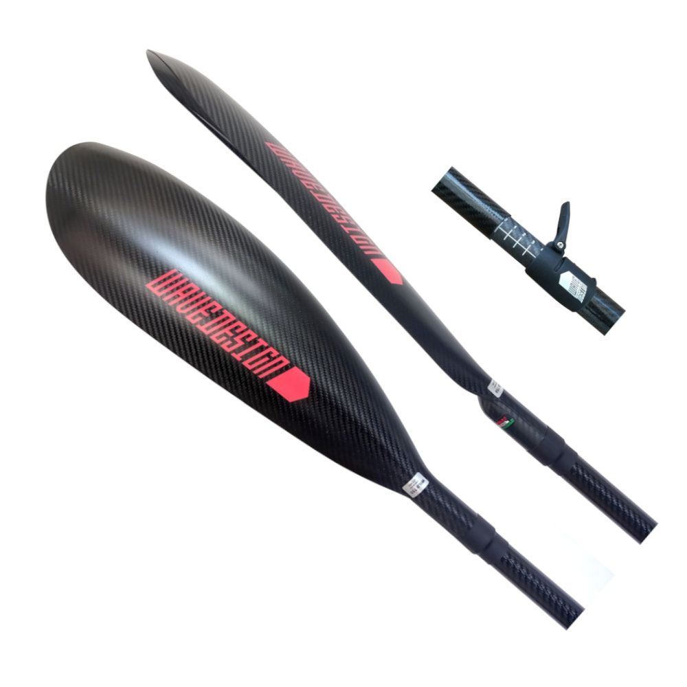 This full carbon wing paddle features a tear drop blade shape and is designed for sprint and marathon racing paddlers, surfski paddlers, and kayakers seeking a more technical paddling experience. The blade delivers a very stable and powerful catch, with a small offset angle that helps anticipate water entry and a high pitch angle, while most of the surface area is concentrated near the tip to provide excellent grip from the first stroke. It is available in multiple configurations, including four blade sizes, one piece or two piece shafts with plus five or plus ten centimeter adjustment, and three different shaft flex options.